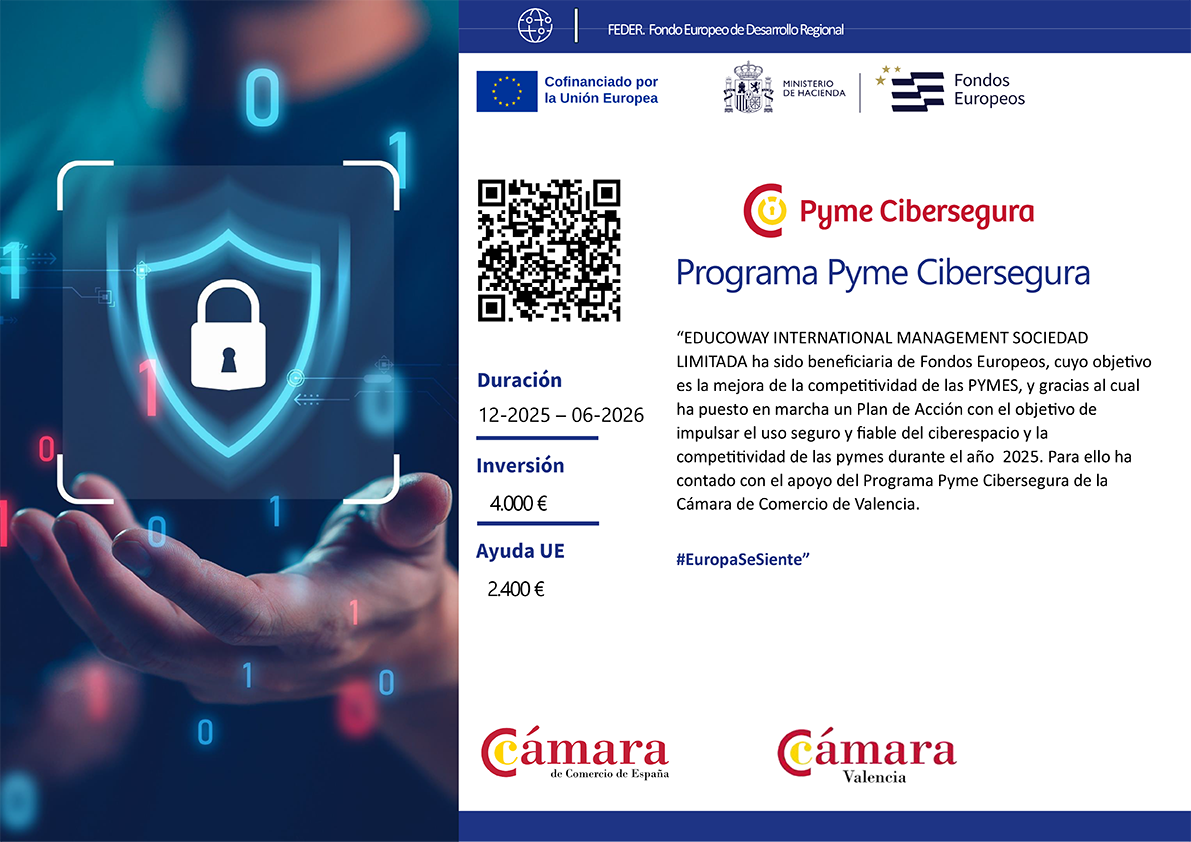 “EDUCOWAY INTERNATIONAL MANAGEMENT SOCIEDAD LIMITADA ha sido beneficiaria de Fondos Europeos, cuyo objetivo es la mejora de la competitividad de las PYMES, y gracias al cual ha puesto en marcha un Plan de Acción con el objetivo de impulsar el uso seguro y fiable del ciberespacio y la competitividad de las pymes durante el año 2025. Para ello ha contado con el apoyo del Programa Pyme Cibersegura de la Cámara de Comercio de Valencia.
